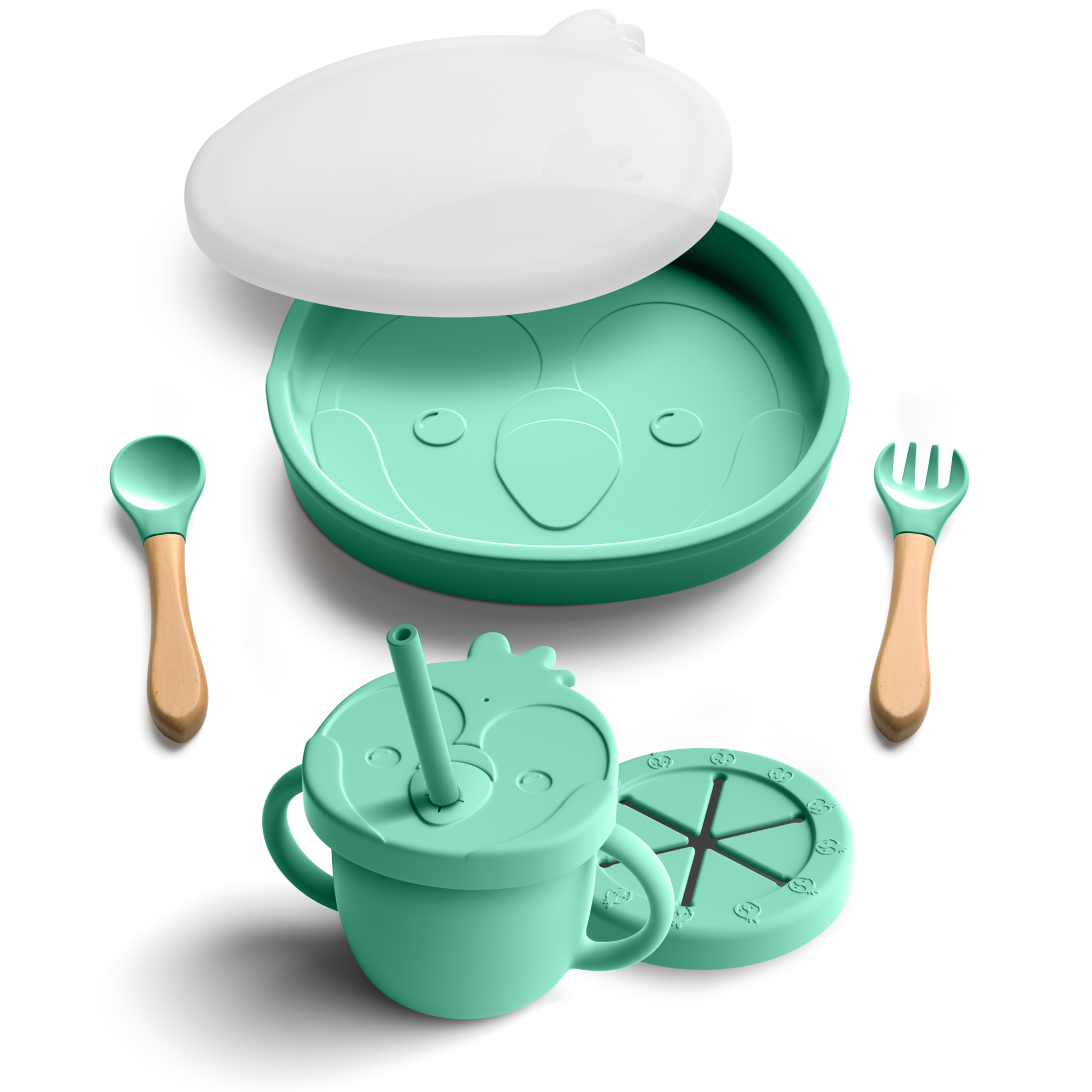 - Transform mealtimes into a delightful and mess-free adventure for your little one with the Bimbly Silicone Feeding Set 8-in-1. This meticulously crafted set is more than just tableware; it's a passport to independent feeding, sensory exploration, and developmental milestones.