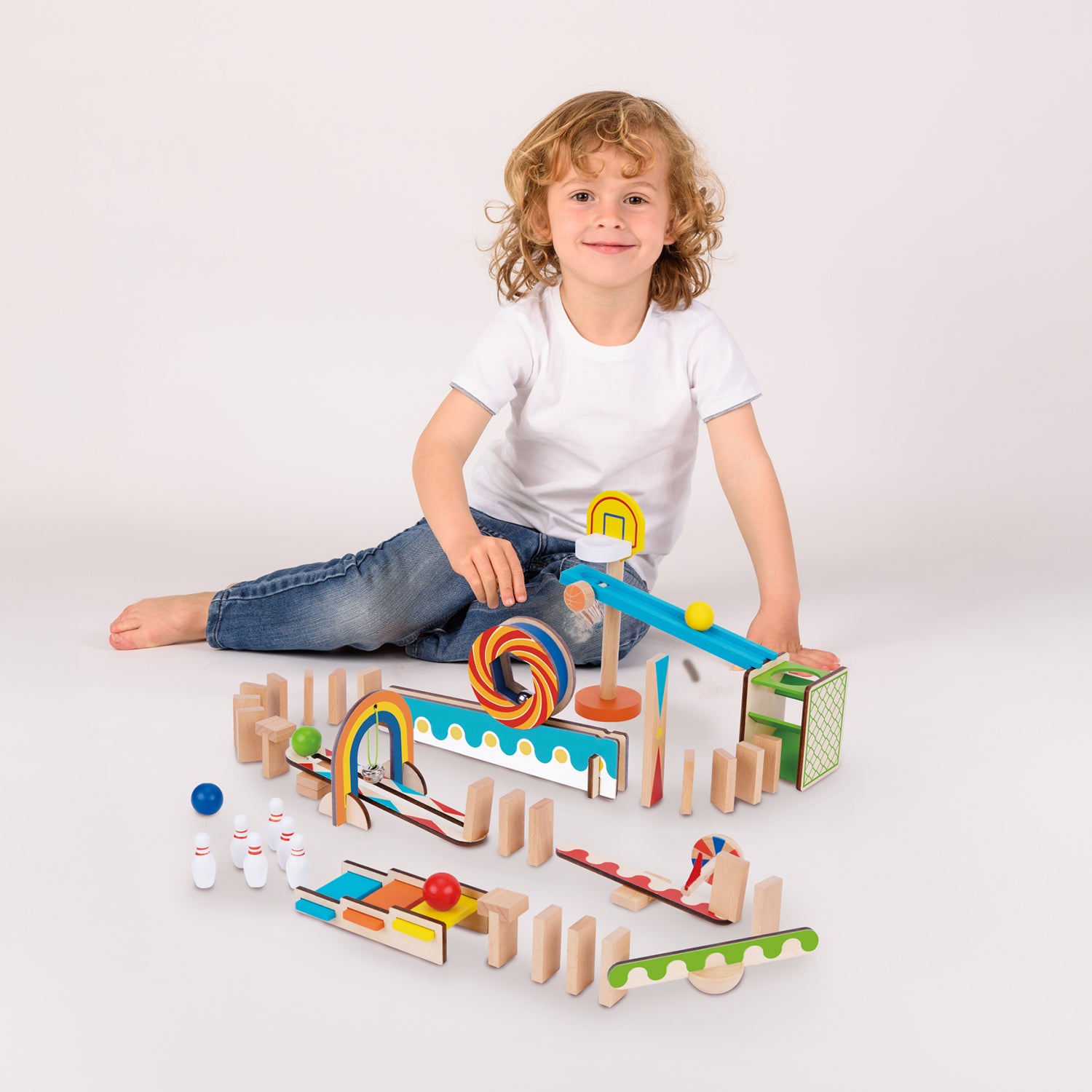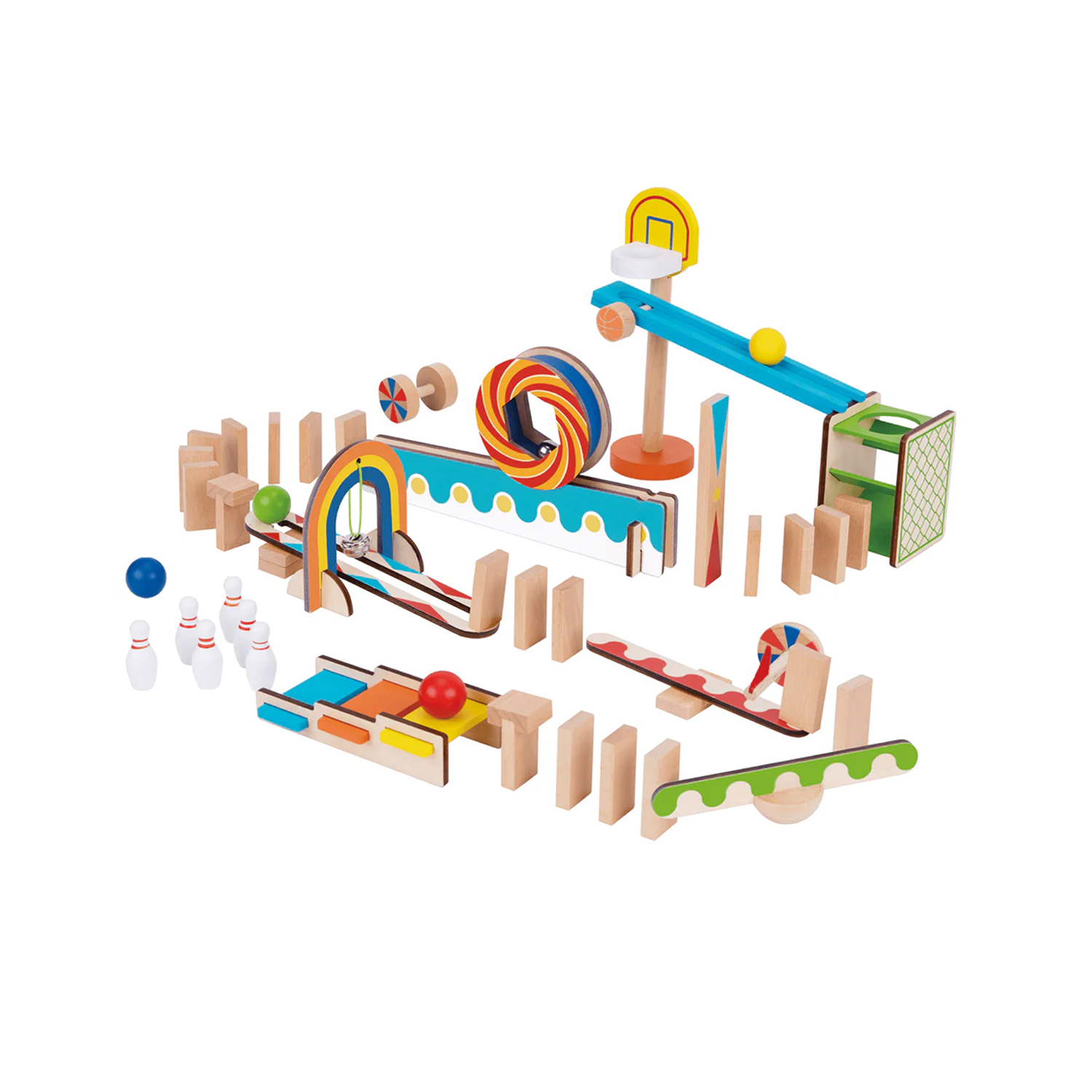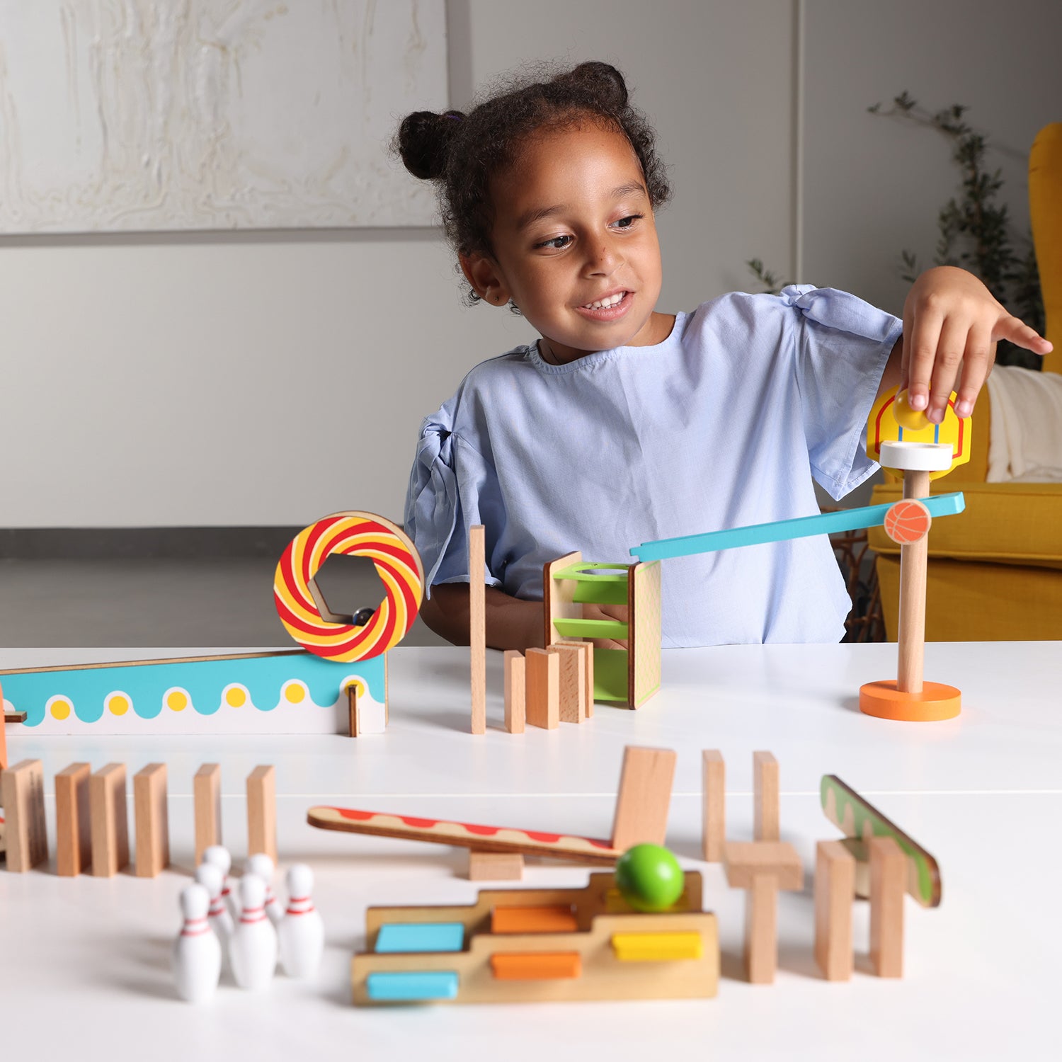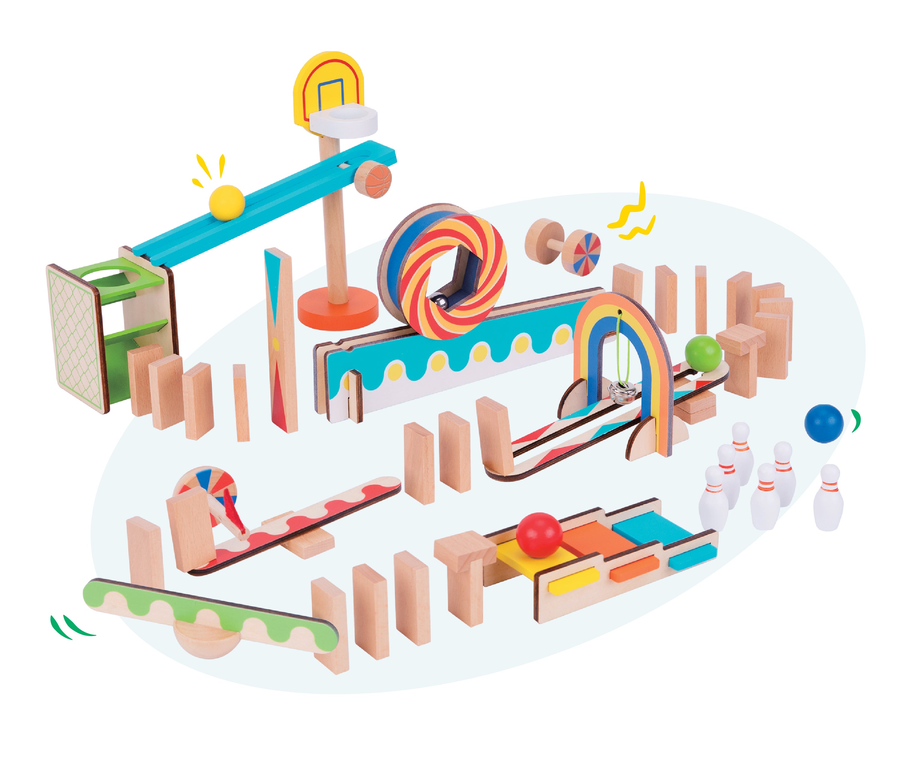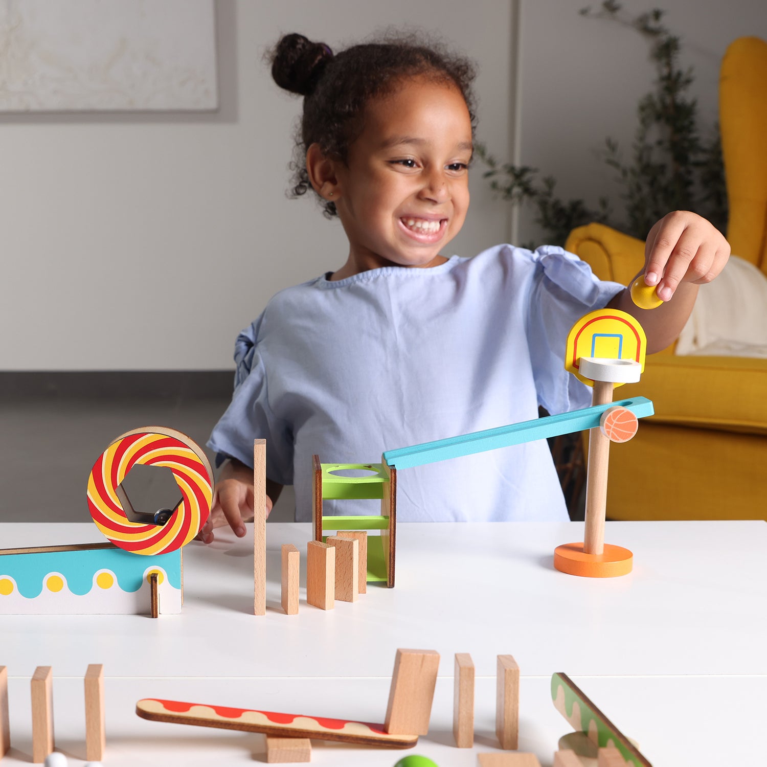 - عيشوا إثارة المسار المزدوج مع أطفالكم: استمتعوا بمشاهدة أطفالكم وهم يركبون مسارات الدومينو المزدوجة، منتظرين بشغف كيف تُطلق كرة السلة تأثير الدومينو الذي ينتهي بمباراة بولينج. إنه مشهد سيُبهر الجميع ويجعلهم يضحكون ويصفقون بفرح.