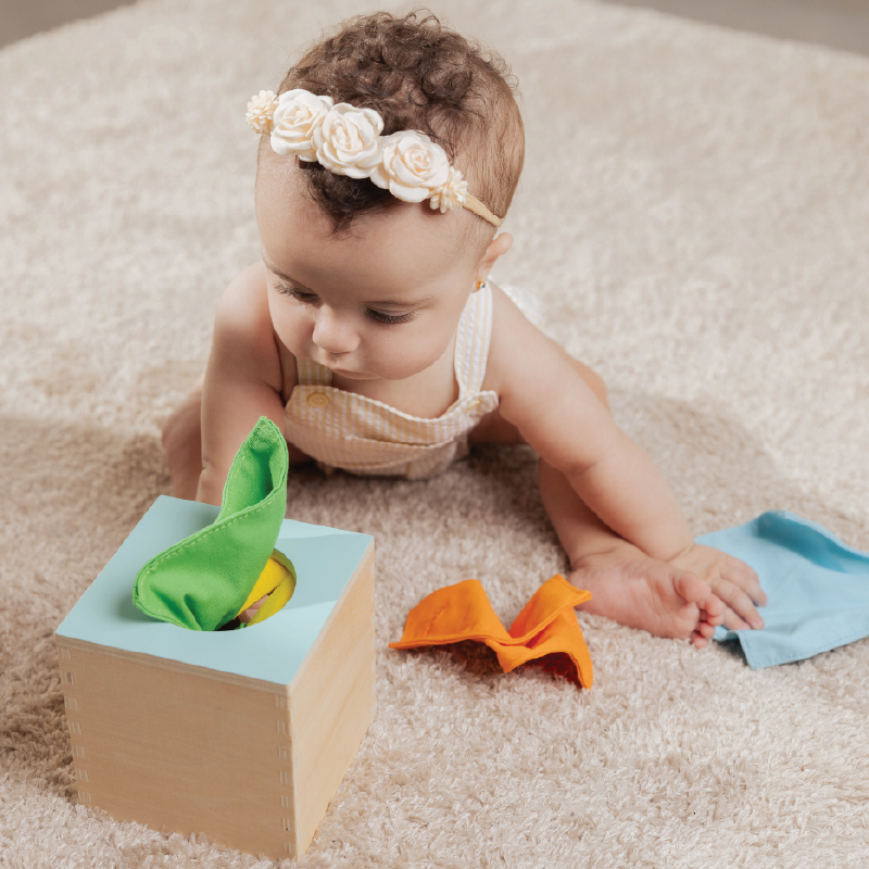 - صندوق المناديل السحري: يحتوي صندوق المناديل السحري على ألوان وملمس أنسجة متنوعة لتشجيع استكشاف الطفل الحسي وتنمية قدراته الحركية الدقيقة.