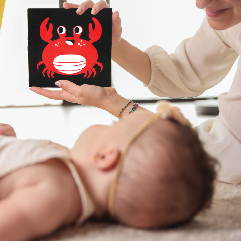 - بطاقات بالأسود والأبيض: تساعد هذه البطاقات عالية التباين بالألوان الأبيض والأسود مع لمسة من الأحمر على جذب انتباه الطفل وتحفيز حواسه وتطوير مهاراته الاجتماعية من خلال الاستكشاف البصري.