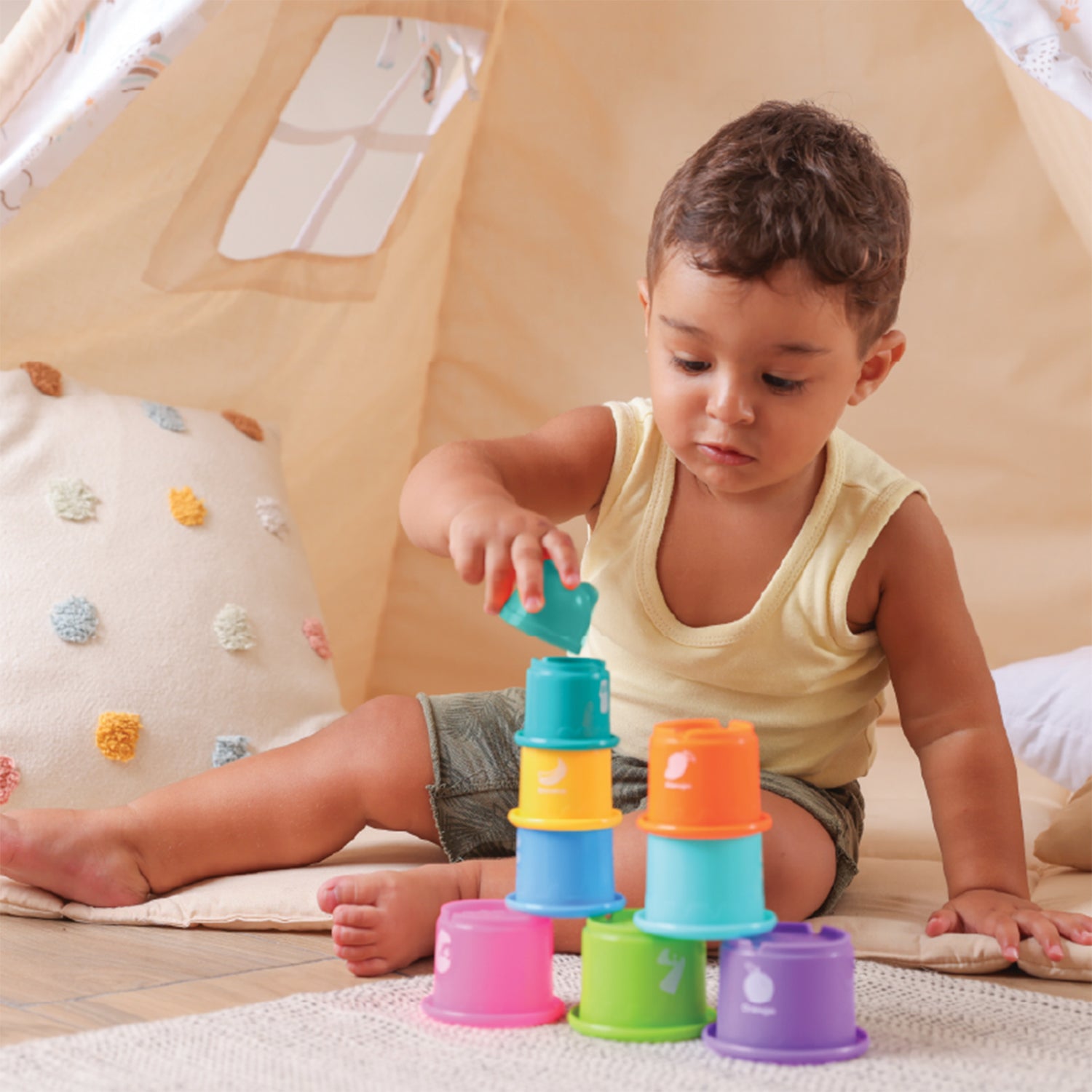 رص الأكواب: تعلم الألوان والأرقام والعد والأحجام، مع تحفيز حاسة البصر وفهم مفهوم السبب والنتيجة.